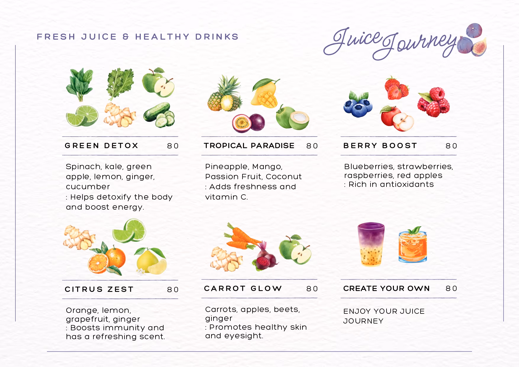 Discover our colorful lineup of detox blends, tropical smoothies, and antioxidant-rich berry boosts — all crafted from farm-fresh fruits and veggies. Your wellness journey starts here at Juice Journey Pai